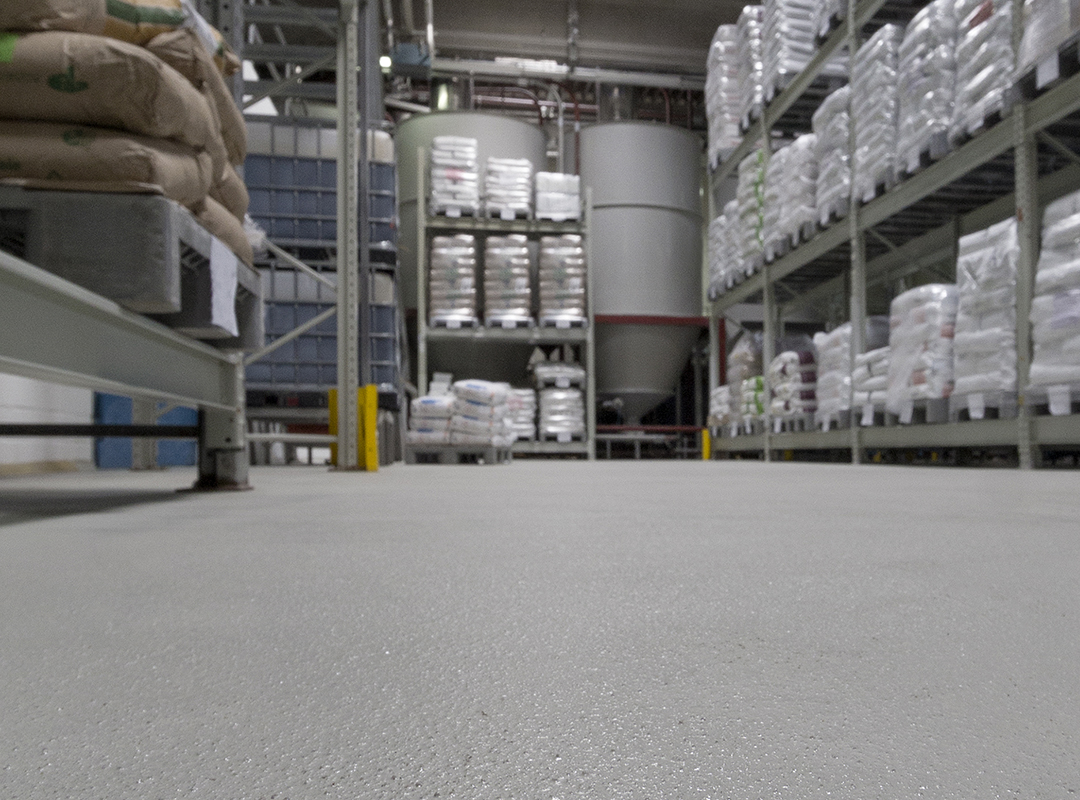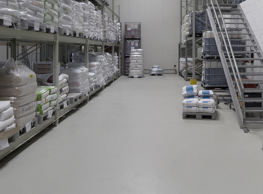 Der Industrieboden sollte eine robuste, strukturierte Nutzfläche mit guter Rutschfestigkeit bieten. Wechselnde Temperaturen in unmittelbarer Nähe zum Tor des Wareneingangs und mittlere mechanische Beanspruchung durch Lagertätigkeiten sollten für die Beschichtung keine Probleme darstellen.