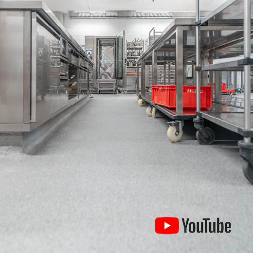 In the commercial kitchen of VfB Stuttgart soccer club, a hygienic, durable and functional commercial kitchen floor covering was installed. The jointless surface needed to be easy ...