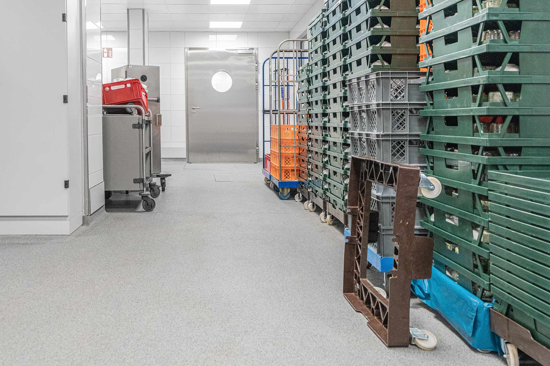 Der eingesetzte Küchenfußbodensystem bietet hier alle Vorteile, die den spezifischen Anforderungen eines Küchenbodens in einem solchen Umfeld gerecht werden. Dank der Rutschfestigkeit durch die Colorquarzsandabsteuung bleibt die Arbeitssicherheit auch in nassbelasteten Bereichen für das Küchenpersonal gewährleistet.
